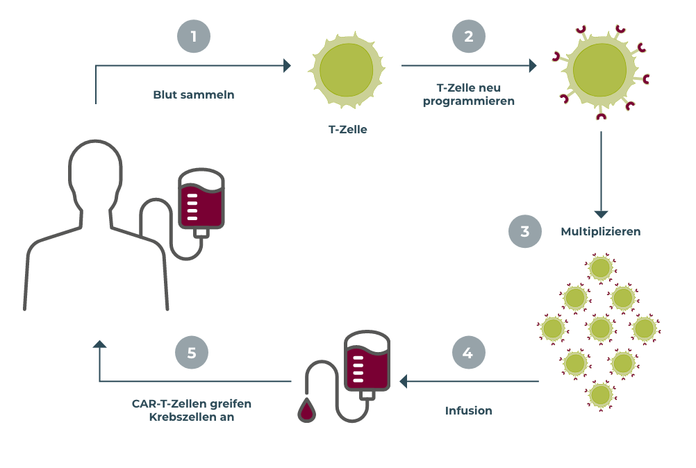 CAR-T-Zell-Therapien werden eingesetzt bei rezidivierenden oder therapieresistenten Tumorerkrankungen, beispielsweise B-Zell-Lymphomen. Bei der CAR-T-Zell-Therapie werden Tumorzellen mittels Antigenerkennung von patienteneigenen, umprogrammierten T-Zellen identifiziert und eliminiert. Hierfür werden patienteneigene T-Zellen ex vivo genetisch verändert, indem die genetische Information für einen Chimeric Antigen Receptor (CAR) in das Genom der T-Zellen inseriert wird.[6,7]