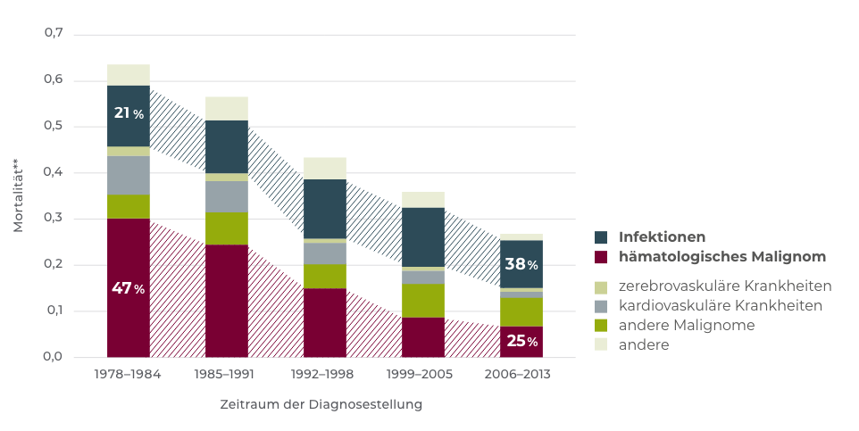 In einer dänischen Registerstudie, in die 10.455 CLL-Patienten einbezogen waren, ging die Sterblichkeit mit Ursache „maligne hämatologische Erkrankung“ im Verlauf von 3 Dekaden – sicher infolge verbesserter Therapiekonzepte – deutlich zurück, wohingegen die infektbedingte Sterblichkeit unverändert hoch geblieben ist.[15]Infektionen sind die Hauptursache für Morbidität und Mortalität bei Patienten mit sekundären Immundefekten.[5]
